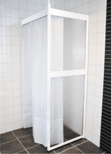 Västia är specialicerade på att utveckla och tillhandahålla duschväggar och stödhjälpmedel till människor med extra behov. För redan våtsäkra golv har vi utvecklat stabila duschväggar. Bilderna visar duschväggen med kompletterings-kit där det ingår överliggare och draperi.